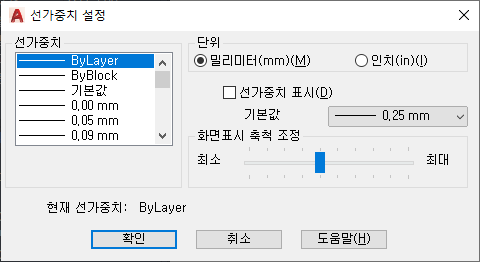도면층에 대한 DEFAULT 선가중치를 조정합니다. (LWDEFAULT 시스템 변수)