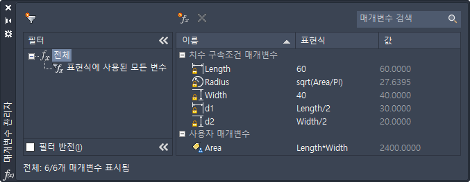 길이 및 폭 치수 구속조건 매개변수는 상수로 설정됩니다. d1 및 d2 구속조건은 길이 및 폭을 참조하는 단순한 표현식입니다. 반지름 치수 구속조건 매개변수는 제곱근 함수, 연산의 우선권을 결정하는 괄호, 면적 사용자 변수, 나누기 연산자, 상수 PI 등을 포함하는 표현식으로 설정됩니다. 이러한 매개변수는 모두 매개변수 관리자에서 액세스할 수 있습니다.