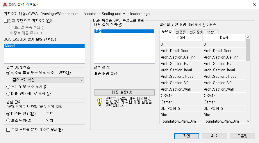 표준은 내보낼 도면에서 데이터를 추출하고, 매핑 미리보기에 표시된 대로 DGN 도면층, 선종류, 선가중치, 색상에 자동 매핑을 적용하는 기본 매핑 설정입니다.