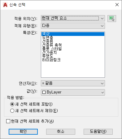 현재 선택 세트에 추가를 선택한 경우 필터링 기준을 전체 도면에 적용합니다.