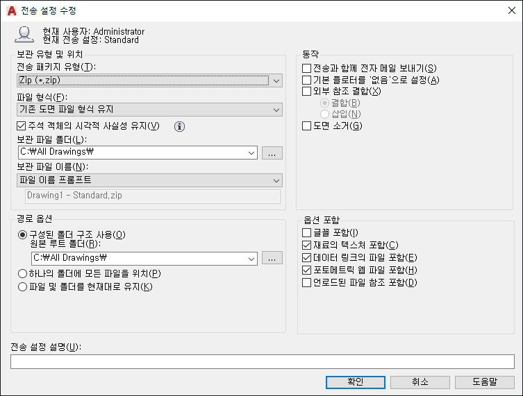 이 필드를 변경하지 않고 그대로 둘 경우, 전송 파일은 첫 번째 지정된 도면 파일이 들어 있는 폴더에 작성됩니다. 시트 세트 환경에서 전송 파일은 시트 세트 데이터(DST) 파일이 들어 있는 폴더에 작성됩니다. AutoCAD LT에는 해당되지 않습니다.