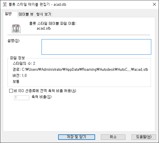 편집하고 있는 플롯 스타일 테이블에 관한 정보 즉, 플롯 스타일의 수, 경로 및 플롯 스타일 테이블 편집기의 버전 번호를 표시합니다.
