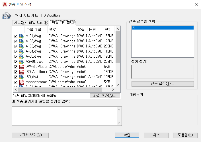 기본적으로 현재 도면과 연관된 모든 파일(예: 관련된 외부 참조, 플롯 스타일 및 글꼴)이 나열됩니다. 전송 패키지에 파일을 추가하거나 기존 파일을 제거할 수 있습니다. URL로 참조된 관련 파일은 전송 패키지에 포함되지 않습니다.