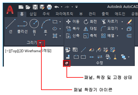 패널을 리본 탭에서 끌어내어 도면 영역이나 다른 모니터에 놓을 수 있습니다. 리본 탭을 전환하는 경우에도 부동 패널은 다시 리본에 배치될 때까지 열린 상태로 유지됩니다.