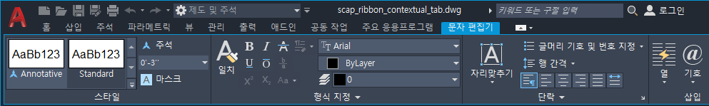 특정 객체 유형을 선택하거나 특정 명령을 시작하면 도구막대 또는 대화상자 대신 상황별 리본 탭이 표시됩니다. 상황별 탭은 명령을 종료하면 닫힙니다.