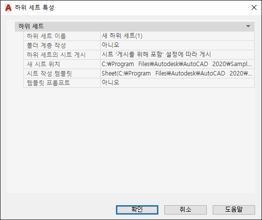 하위 세트에 대한 새 도면 파일을 작성하기 위해 사용되는 도면 템플릿(DWT) 파일 및 배치 이름을 지정합니다.