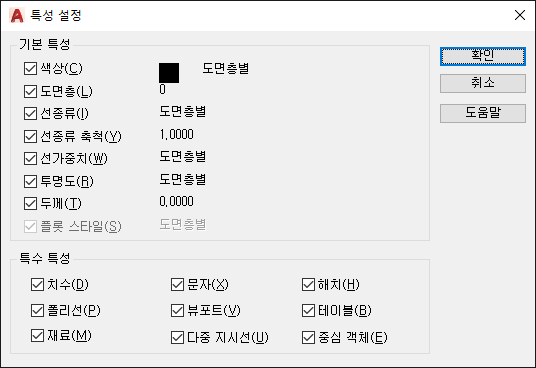 대상 객체의 도면층을 원본 객체의 도면층으로 변경합니다. 모든 객체에 사용 가능합니다.