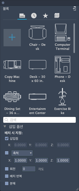 현재 도면, 최근에 사용한 블록, 즐겨찾기의 블록 또는 라이브러리에 저장된 블록에 액세스하고 이러한 블록을 삽입할 수 있습니다.