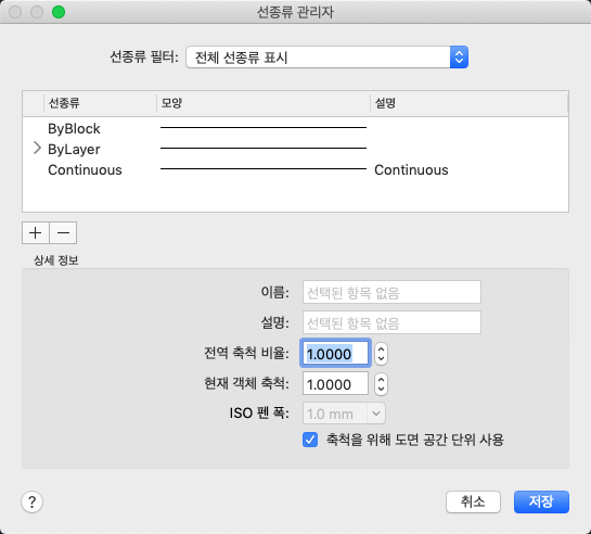 모든 선종류에 대한 전체 축척 비율을 표시합니다. (LTSCALE 시스템 변수)
