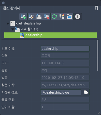 참조 관리자 팔레트에는 맨 위를 따라 표시되는 도구막대가 있습니다. 파일 리스트를 마우스 오른쪽 버튼으로 클릭하면 외부 참조를 부착하거나 부착한 외부 참조를 관리할 수 있는 바로 가기 메뉴가 표시됩니다. 도구막대에서 상세 정보 표시 버튼을 클릭하면 선택한 외부 참조에 대한 상세 정보 및 썸네일 미리보기가 표시됩니다.