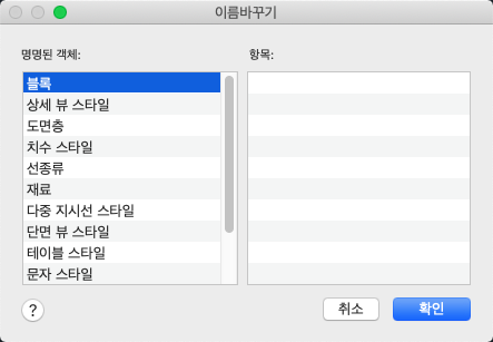 도면층 및 치수 스타일과 같은 명명된 객체에 지정된 이름을 변경합니다.