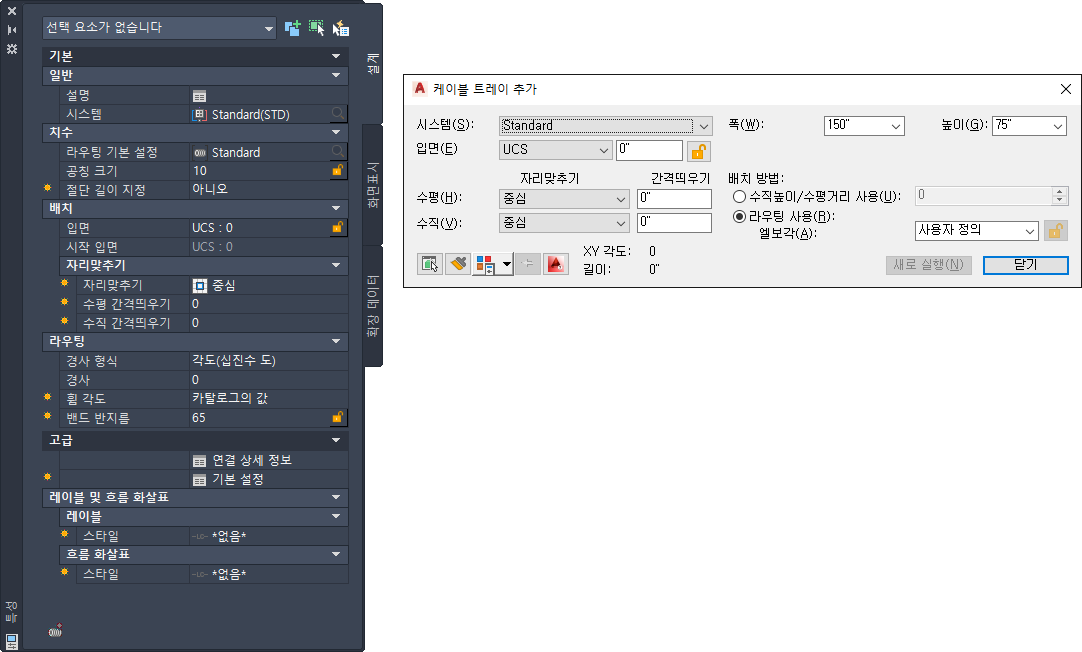 2. 나머지 단계에서는 전선관 설정에 대해서는 특성 팔레트를 사용하고 케이블 트레이 설정에 대해서는 케이블 트레이 추가 대화상자를 사용합니다(다음 그림 참고).