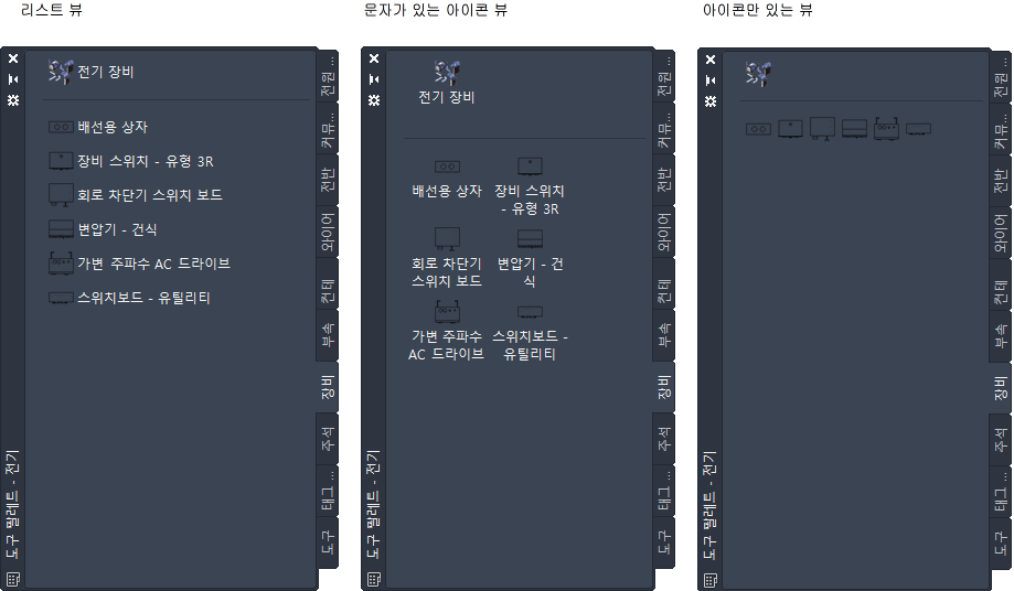 추가 도면 공간 필요, 도구와의 익숙함 및 도구 이미지의 복잡성과 같은 여러 요소가 선택하는 도구 모양에 영향을 줄 수 있습니다. 예를 들어, 새 사용자는 도구 이름 및 이미지를 제공하는 단일 열 리스트로 작은 이미지와 함께 도구를 표시할 수 있습니다. 또는 숙련된 사용자의 경우 도면 공간을 최대화하기 위해 중간 크기의 이미지와 함께 이름 없이 도구를 표시할 수 있습니다.