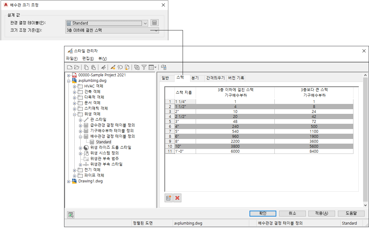 배수 런을 3층 이하에 걸친 스택 또는 4층 이상에 걸친 스택으로 정의하면 위생 모듈에서 배수관경 결정 테이블(관경 결정 테이블)의 스택 탭에 있는 정보를 사용하여 크기 조정 계산을 수행합니다. 이 배수관경 결정 테이블의 정의는 스타일 관리자에서 확인할 수 있습니다.