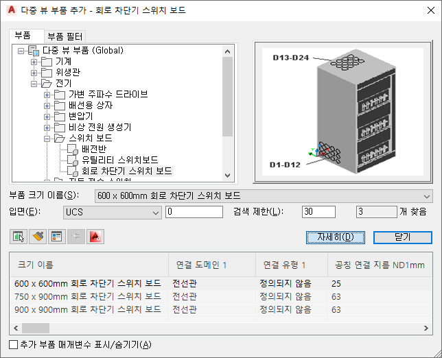 전기 도구 팔레트 그룹의 장비 도구 팔레트에 포함된 도구를 사용하여 전기 장비를 추가합니다. 도구를 선택하고 다중 뷰 부품 추가 대화상자를 사용하여 부품을 선택한 다음 해당 특성을 구성하고 부품을 도면에 추가합니다.