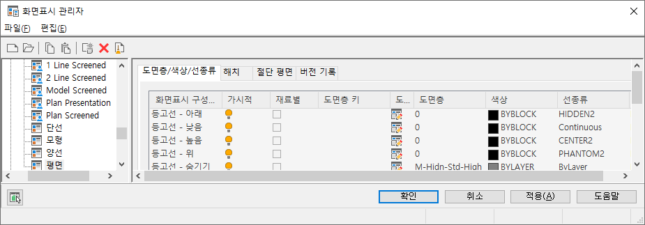 화면표시 설정에서는 화면표시 범위 위나 아래에 있는 객체를 구별합니다. 예를 들어, 입면에 따라 다르게 표시되도록 선종류 및 선 색상을 설정할 수 있습니다. 또한 화면표시 설정을 사용하여 객체를 입면에 따라 숨길 수도 있습니다. 여러 층을 포함하는 모형에서 특정 바닥 평면에 대한 시공 도서를 작성할 때 객체를 숨기면 유용합니다.