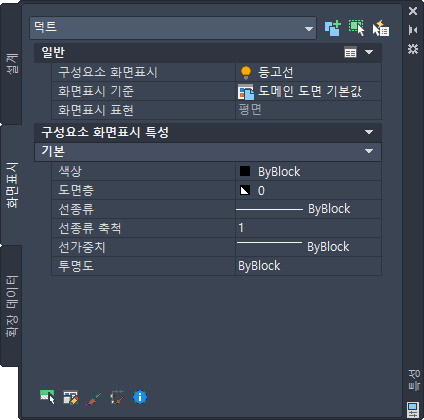 특성 팔레트의 화면표시 탭을 사용하여 AutoCAD MEP 2021 toolset 도면에 있는 객체의 그래픽 특성을 직접 제어할 수 있습니다.