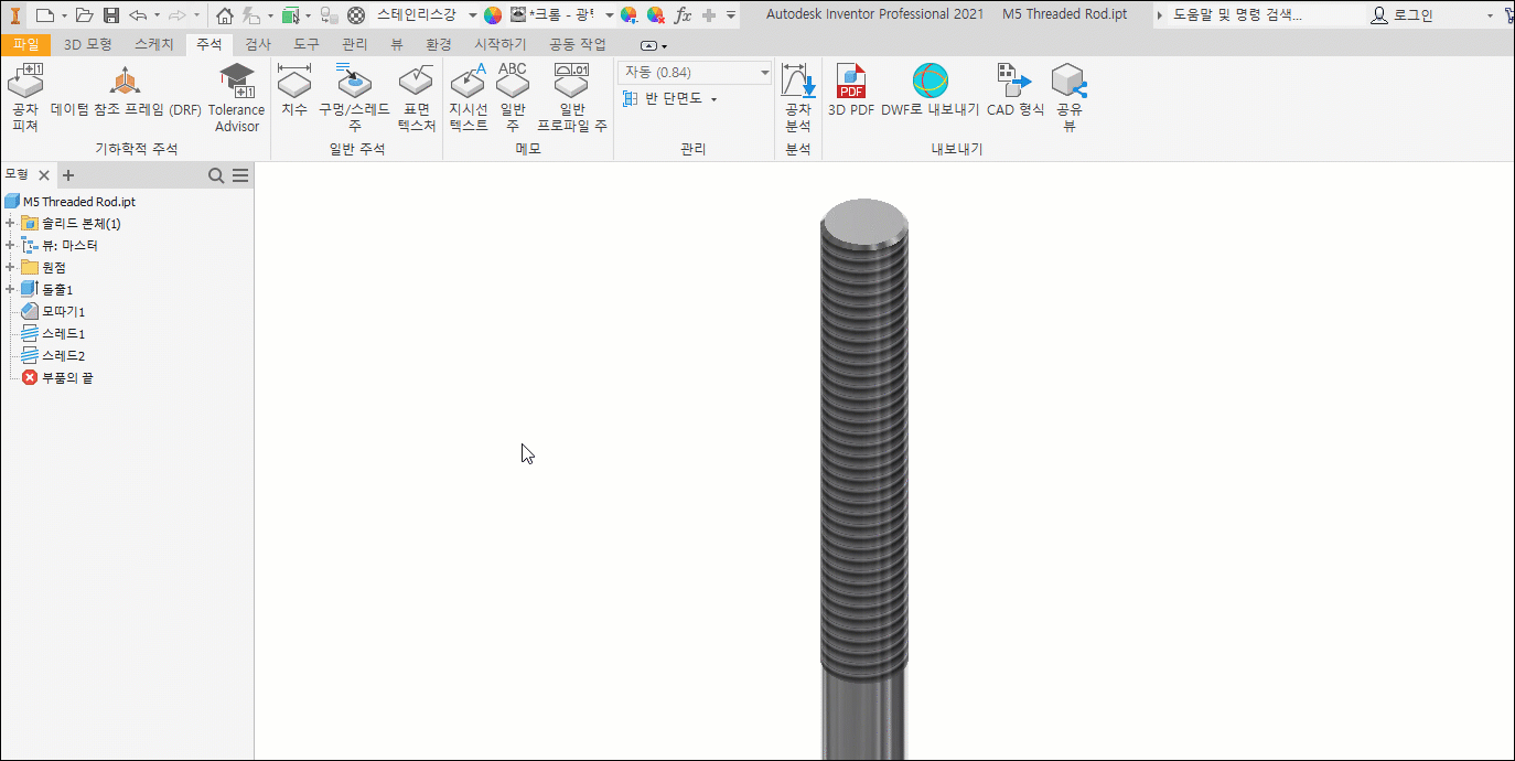 1. 부품, 조립품 또는 도면 파일에 외부 스레드 주 또는 내부 스레드 주를 작성합니다.
