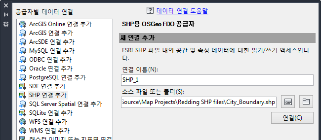 - 데이터 연결 윈도우의 공급자별 데이터 연결(왼쪽) 아래에서 SHP 연결 추가를 선택합니다.
