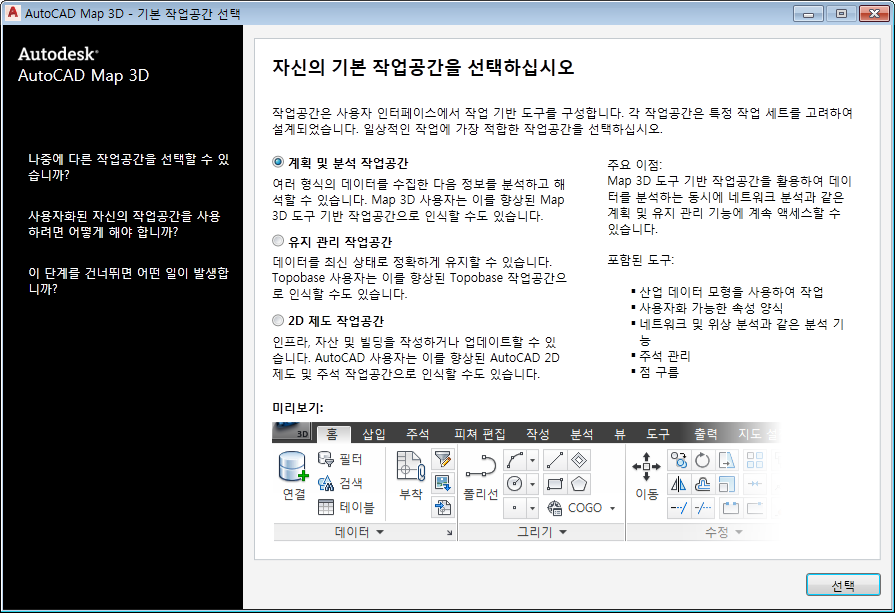 AutoCAD Map 3D toolset에는 미리 정의된 작업공간이 함께 제공됩니다. 각 작업공간마다 명령과 도구막대가 다르게 구성되거나 표시됩니다. AutoCAD Map 3D toolset을(를) 처음 시작하면 기본 작업공간을 선택하라는 프롬프트가 표시됩니다.