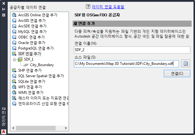 SDF 공급자를 선택하고 샘플 파일 CITY_BOUNDARY.SDF를 찾습니다.