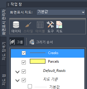 화면표시 관리자 탭에는 현재 지도의 도면층이 표시됩니다.