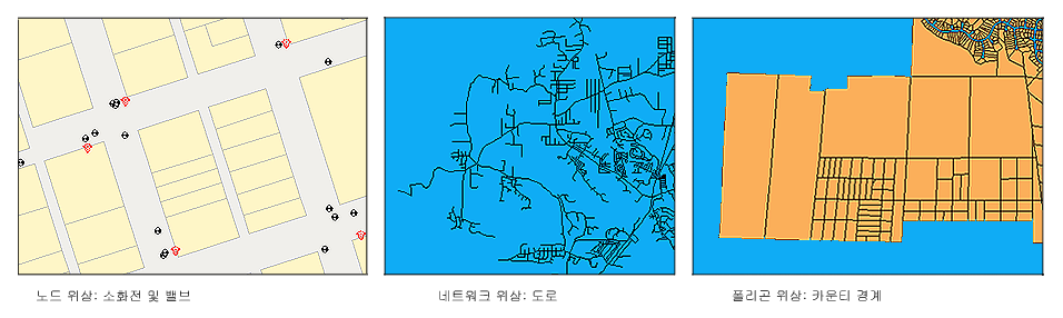 네트워크 위상의 예는 양수 시설에서 거주지까지의 물흐름을 추적하는 상수도 분포 응용프로그램을 들 수 있습니다. 그 외에 가로망도 해당됩니다. 네트워크 위상의 경우 링크의 방향을 지정하고 링크 또는 노드의 저항 계수를 지정할 수 있습니다.