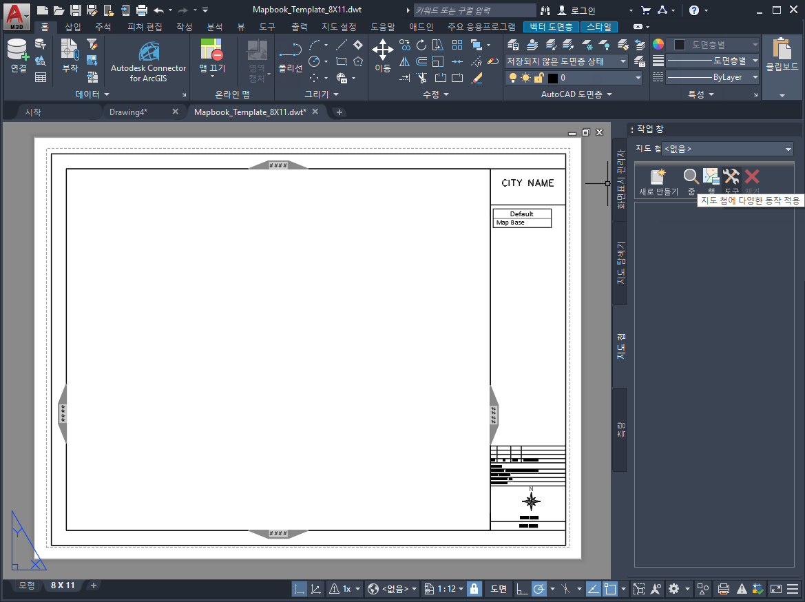 지도 첩 템플릿을 정의하고 지도를 저장하면 지도 첩을 플로터 또는 DWF 파일에 게시할 수 있습니다.