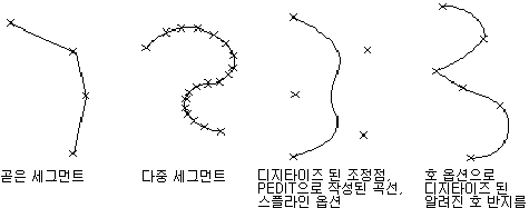 - PLINE 또는 MAPDIGITIZE로 불규칙한 곡선을 디지타이즈하는 경우 선택된 정점의 간격은 선의 굴곡에 따라 달라집니다. 세그먼트가 직선에 가까울수록 필요한 점의 개수가 적어집니다.