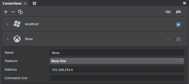 In the interactive editor, use the Connections panel (Window > Deploy and Connect > Connections) to set up a connection to the Xbox One device: