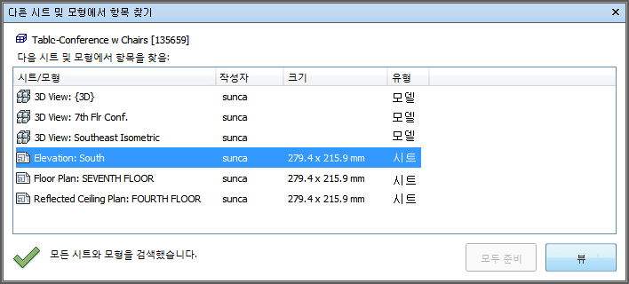 다른 시트 및 모형에서 항목 찾기는 시트 검색기를 통해 준비된 모든 시트/모형에서 객체를 검색할 수 있는 고정 가능한 창입니다.