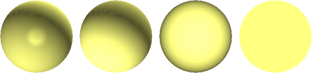 아래의 구에서는 조명 스타일이 장면에 끼치는 효과를 보여 줍니다. 왼쪽에서 순서대로 최대 라이트, 장면 라이트, 헤드 라이트 및 라이트 없음이 나열됩니다.