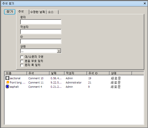 주석 빠른 찾기 문자 상자에 모든 주석에서 검색할 문자열을 입력합니다. 이 문자는 한 단어나 몇 개의 단어일 수 있습니다. 따라서, 예를 들어 수정 지시를 입력하고 검색을 실행하면 하나의 "수정 지시" 단어가 포함된 주석만 반환됩니다.