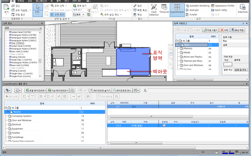 백아웃 기능을 사용하여 형상 조각을 절단합니다. 백아웃을 그려 기존 영역 테이크오프 조각을 제외시킵니다. 백아웃은 예를 들어 테이크오프의 바닥 영역 위에 표식을 지정했지만 테이크오프에서 복도와 같은 해당 영역의 단면을 제외하려는 경우 유용합니다. 그러면 복도 백아웃 영역이 Quantification 통합 문서의 바닥 영역에서 "빠집니다".
