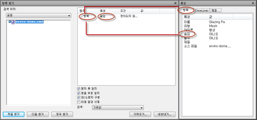 이 프로세스의 핵심 부분은 항목 찾기 창에서 특정 모형 특성이 있는 항목을 찾고 해당 특성을 XML 파일로 내보내고 이를 수정하여 선택한 테이크오프 특성에 매핑하는 것입니다. 항목 찾기 창과 특성 창을 나란히 놓고 보면 도움이 될 수 있습니다.