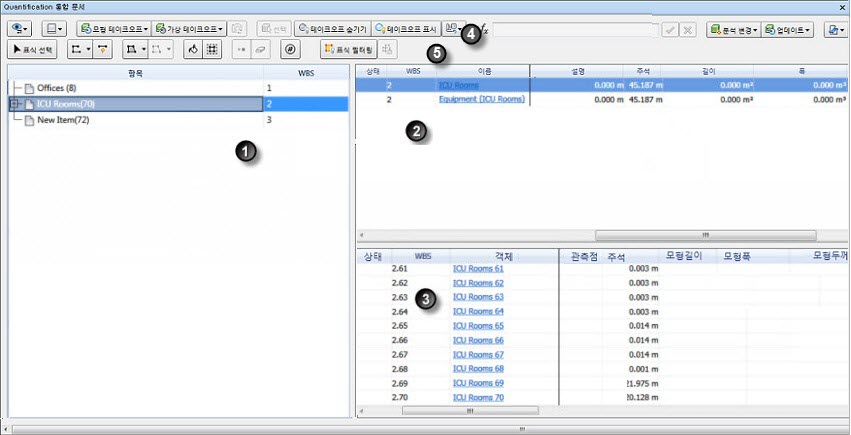 1. 탐색 창. 항목 및 WBS(작업 분류 체계) 코드 리스트가 포함되어 있습니다.