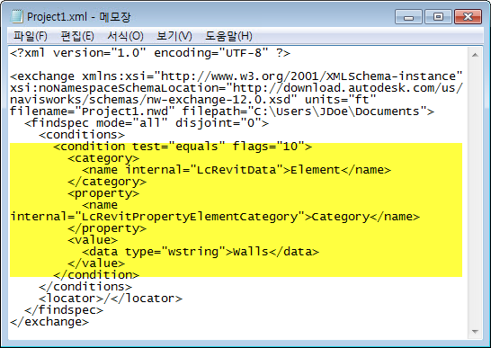 특성 맵 파일(여기에서는 C:₩Program Files₩Autodesk₩Navisworks Manage 2015₩Quantification₩takeoff_maps₩TakeoffPropertyMap.xml)을 엽니다. 또는 선택한 파일 맵 템플릿을 사용합니다. 복사한 텍스트를 특성 맵 파일에 붙여넣습니다. 기존 조건 노드가 파일에 있는 경우 찾아 바꿉니다.