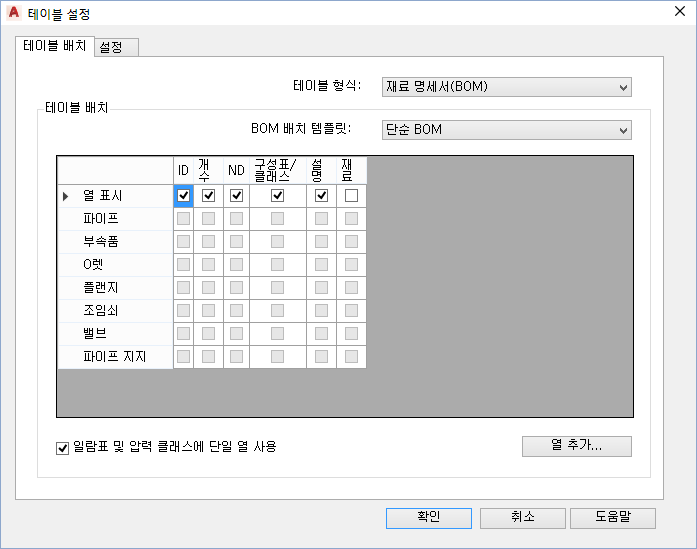 BOM 테이블 유형 및 열을 구성합니다.