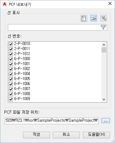 내보내는 PCF(파이프 구성요소 파일)에 포함할 선을 선택합니다.