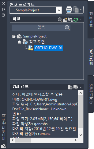프로젝트 관리자에서 직교 DWG 탭을 클릭합니다.