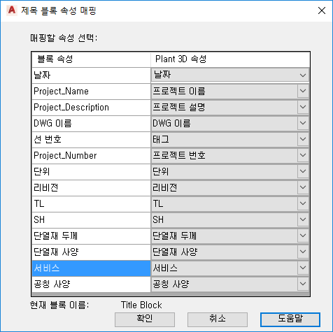 제목 블록 속성을 Plant 3D 특성에 매핑합니다.