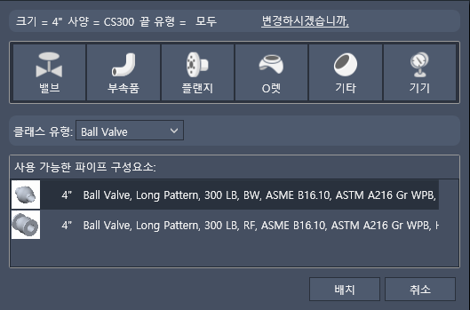 배치할 구성요소를 지정합니다. 현재 사양, 크기, 끝 유형 및 클래스 유형과 일치하는 파이프 구성요소 리스트를 표시합니다.