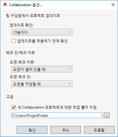 옵션시간 간격: 서버를 확인하여 팀 구성원이 업데이트한 파일 및 프로젝트 정보를 콤보 상자에 지정된 간격에 따라 다운로드합니다. 기본적으로 프로젝트가 지정된 간격에 따라 자동으로 업데이트됩니다.