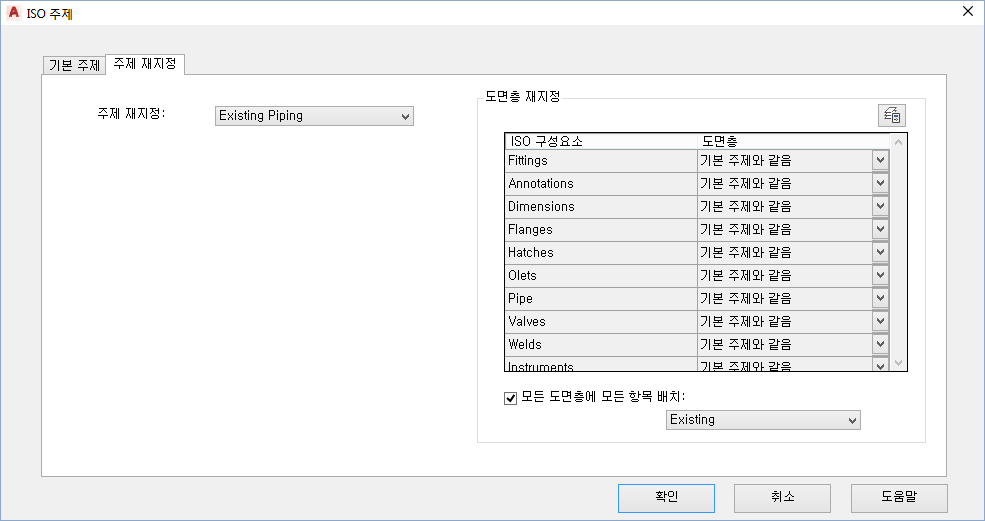 각 ISO 구성요소를 표시할 도면층을 지정합니다. 기본적으로 모든 도면층은 기본 주제와 같음으로 설정됩니다. 구성요소 리스트에는 부속품, 플랜지, 해치, 단열재, 기기, 파이프, Olet 및 밸브가 포함됩니다. 테이블과 같은 전역 구성요소)는 제외됩니다.