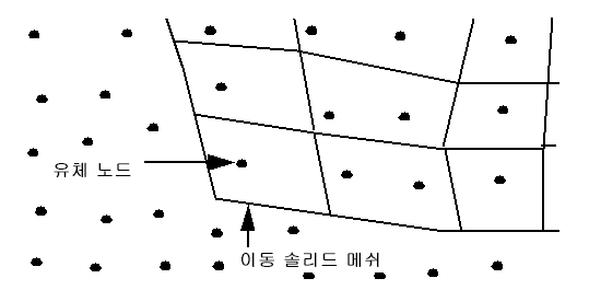 은 로컬 좌표계 원점의 전역 위치입니다.각 시간 단계에서 새 메쉬를 만들지 않고, 솔리드 메쉬가 유체 메쉬를 바로 통과하도록 허용됩니다. 유체 노드가 솔리드 요소로 "마스킹"되면 가장 가까운 솔리드 노드의 속도가 이 마스킹된 유체 노드에 적용됩니다. 다이어그램에서, 화살표로 표시된 유체 노드는 이동 부품 구석에 있는 솔리드 요소에 의해 마스킹됩니다. 이동 부품의 경계 내에 있는 모든 유체 노드는 "마스킹"된 것으로 간주되므로 해당 속도가 이동 솔리드에 의해 제어됩니다.
