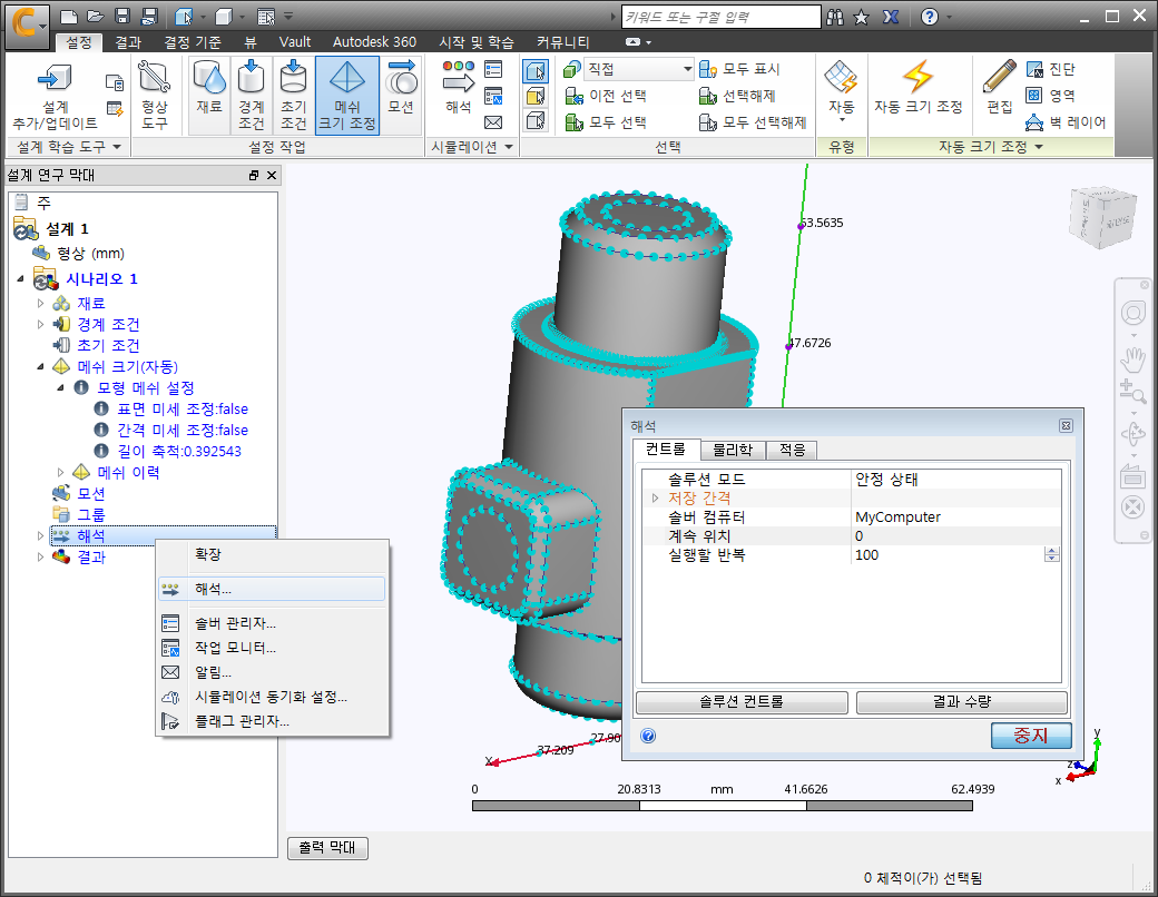 방법 1: 모형을 마우스 오른쪽 버튼으로 클릭한 후 해석을 선택합니다.
