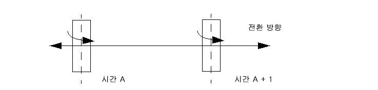 회전 축의 위치는 객체의 변환에 따라 결정됩니다. 그렇지만 변환 방향은 회전의 영향을 받지 않습니다. (이 종류의 동작은 이 장 뒷부분에 설명되어 있는 슬라이딩 베인 동작 유형을 사용하여 구현됩니다.)