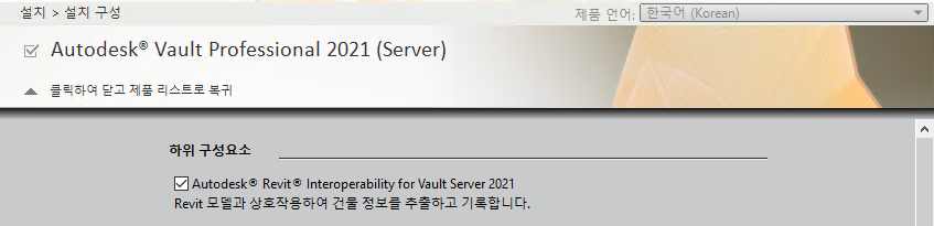 Revit Interoperability Add-In은 Vault 서버 설치 중에 설치됩니다. 설치 구성 화면에서 Revit Interoperability를 포함하도록 Vault 서버 옵션을 사용자화해야 합니다.