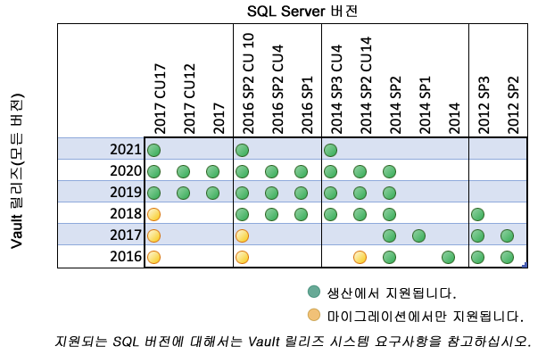 다음 차트에는 호환되는 Vault 및 SQL 릴리즈가 녹색 점으로 요약되어 있습니다. 노란색 점은 권장 업그레이드 경로입니다. Vault와 SQL 제품 버전 간의 호환성을 확인하려면 해당 Vault 릴리즈에 대한 Vault 시스템 요구사항을 참조하십시오.