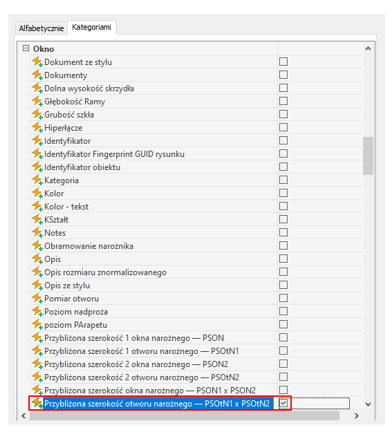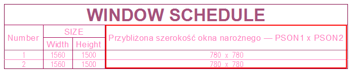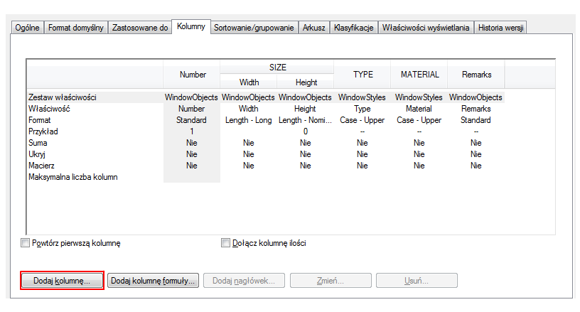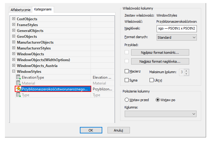 W oknie dialogowym Dodaj kolumnę, w obszarze Style okien wybierz opcję Przybliżona szerokość otworu narożnego — psotn1 x psotn2.